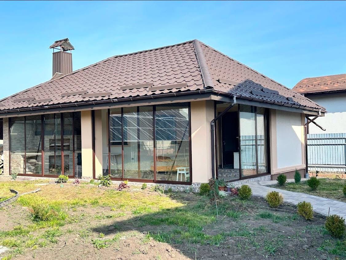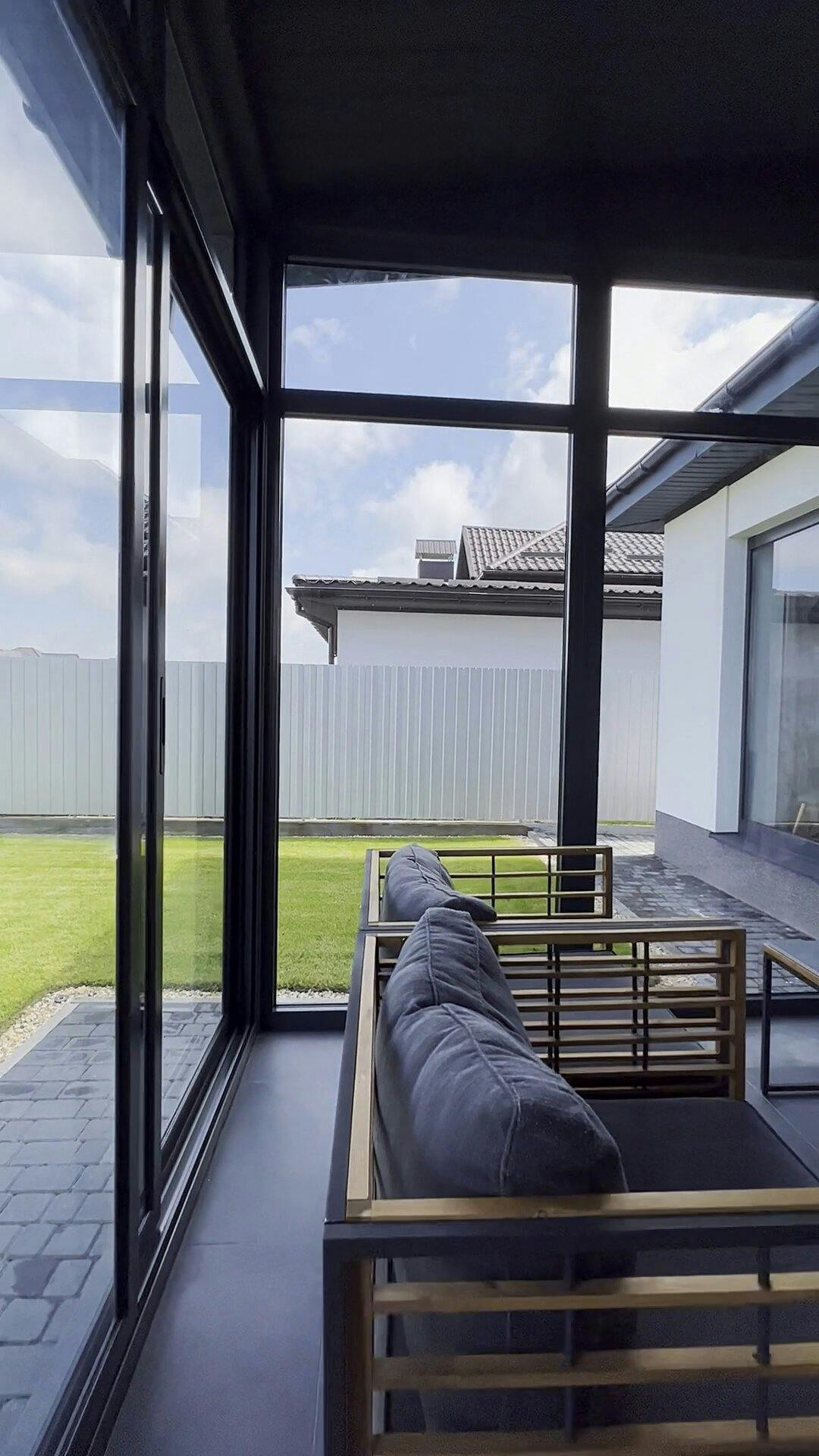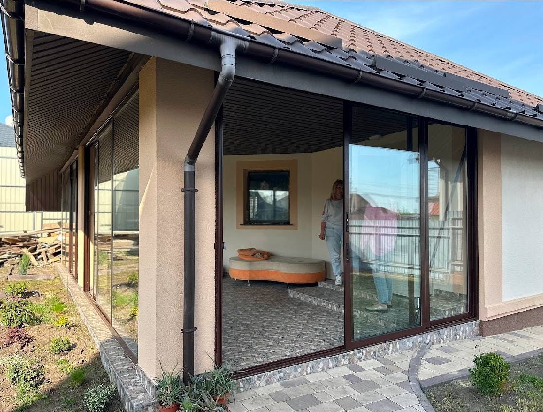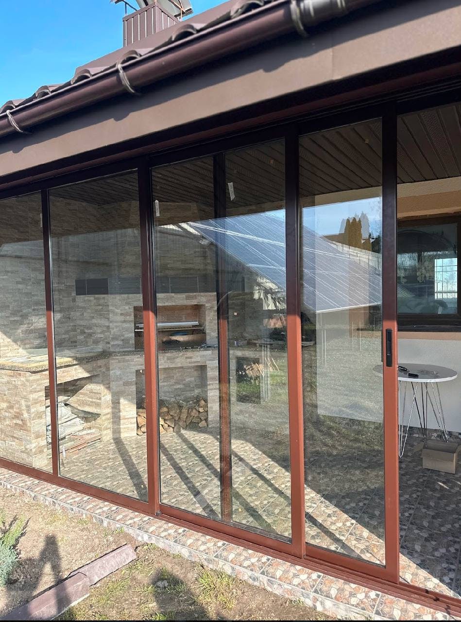 Затишна альтанка-тераса окремо від будинку з каміном та зоною для відпочинку. Засклення було виконано за допомогою профільної системи розсувного типу М900 - легка в монтажі та користуванні забезпечить Вам надійність та комфорт.