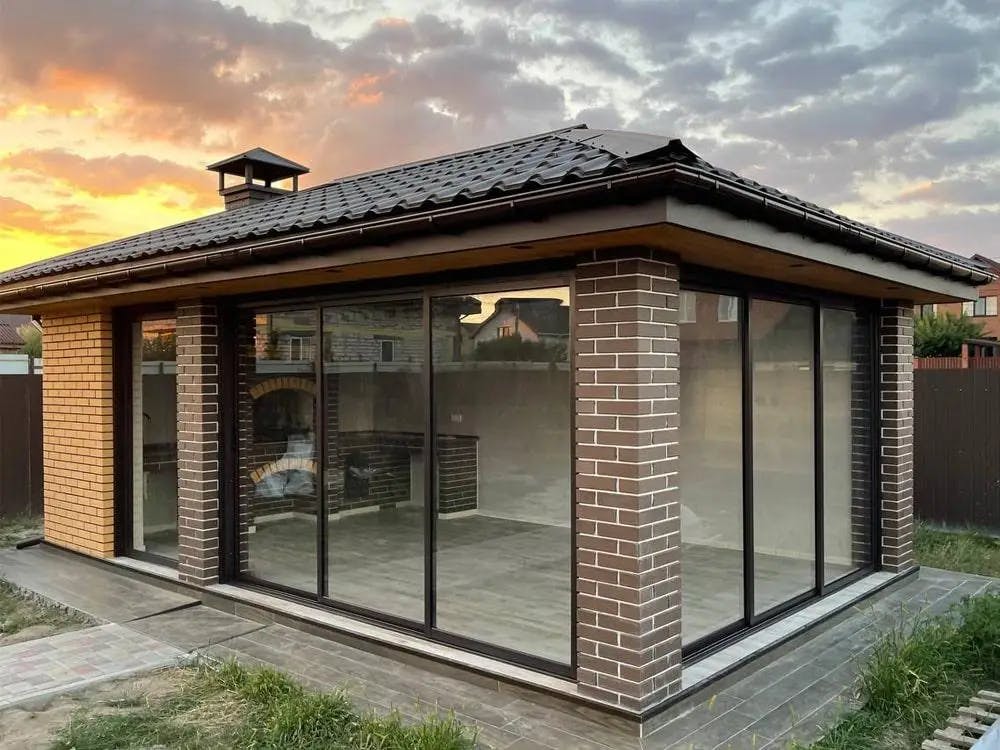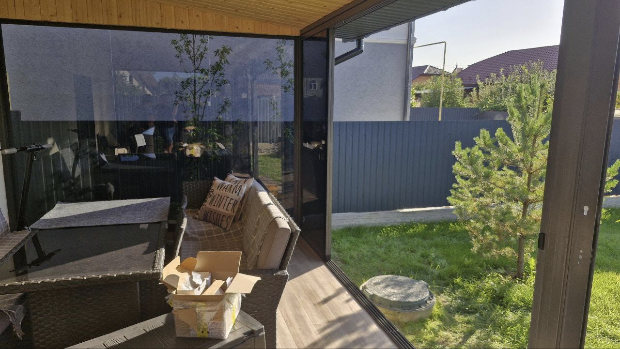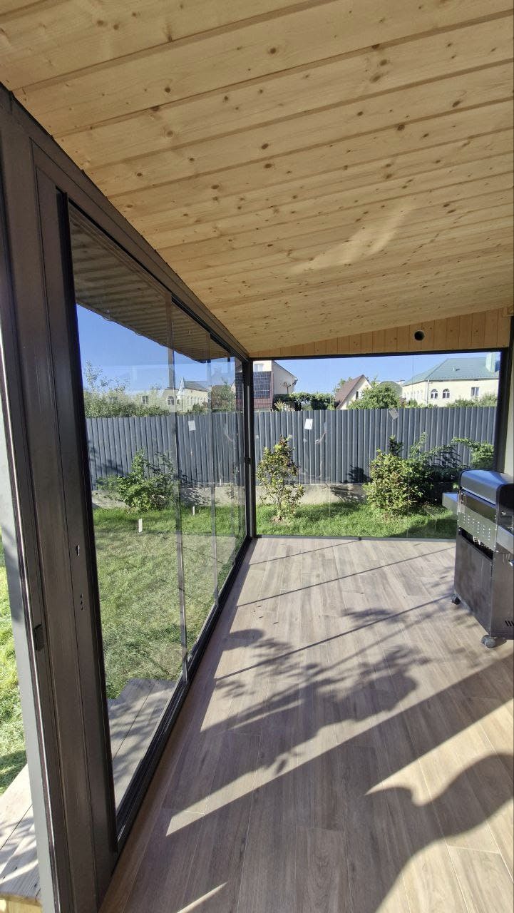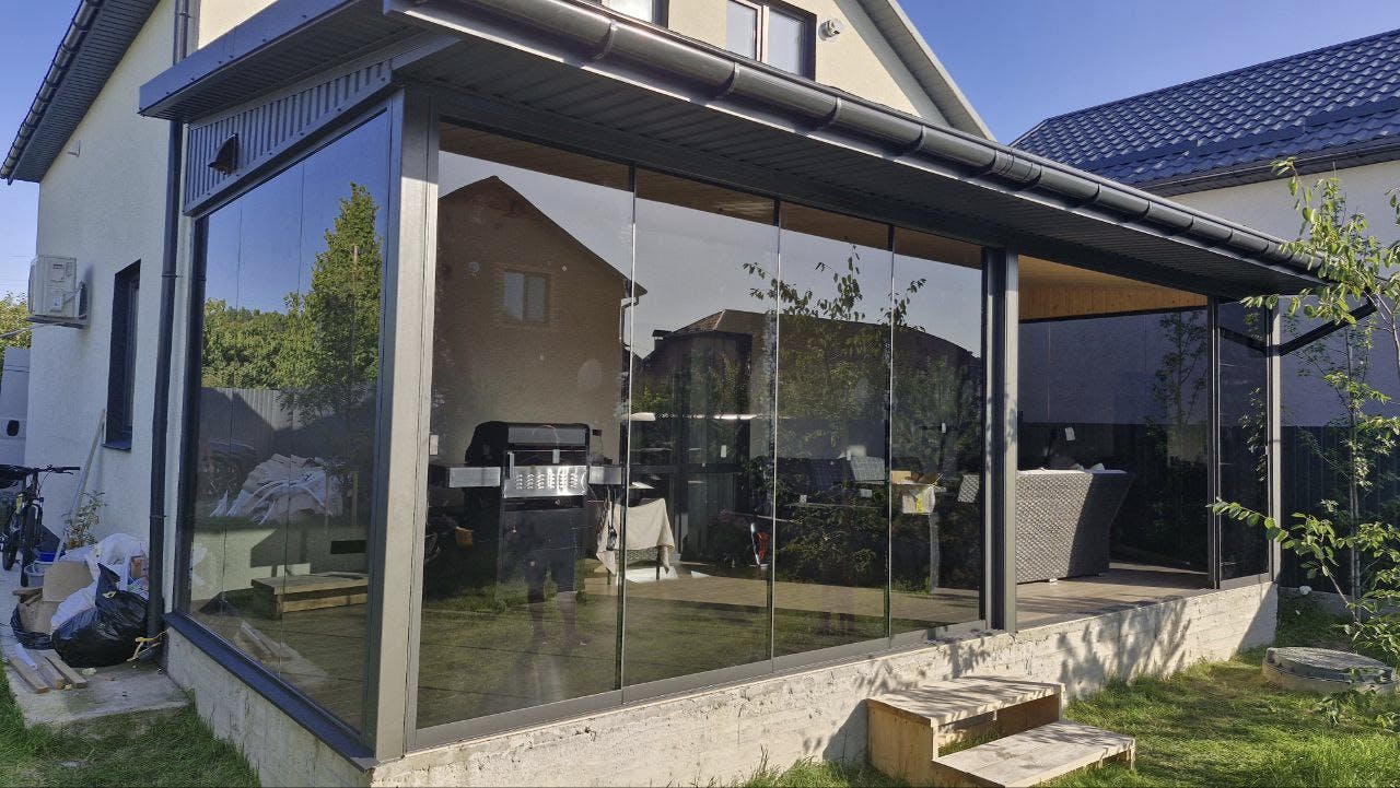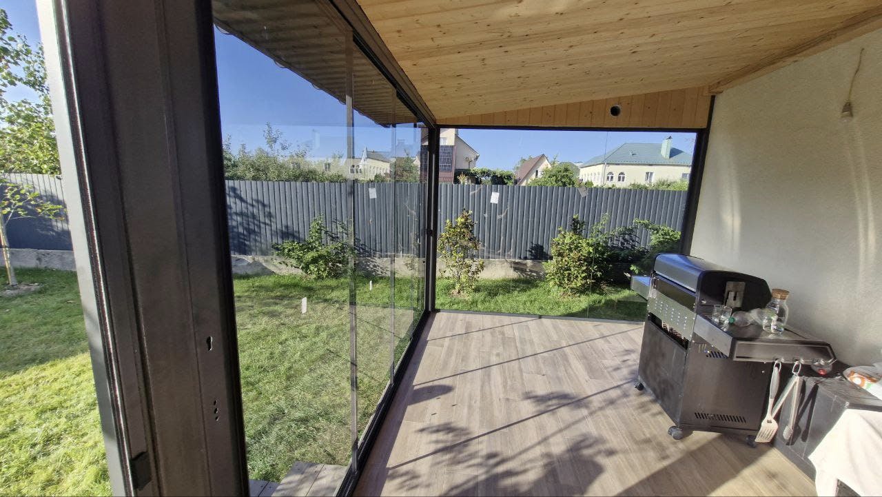 Конструкція виконана з загартованого сонцезахисного скла, яке зменшує вплив прямих сонячних променів, забезпечує комфорт і зберігає легкість простору. Прозорі панелі без рам створюють ефект відкритості та панорамного огляду, водночас захищаючи від вітру й опадів. Це ідеальне місце для барбекю, дружніх зустрічей і повноцінного релаксу просто біля вашого дому.