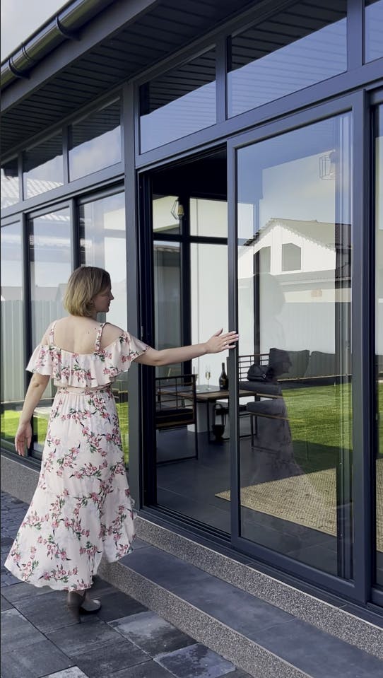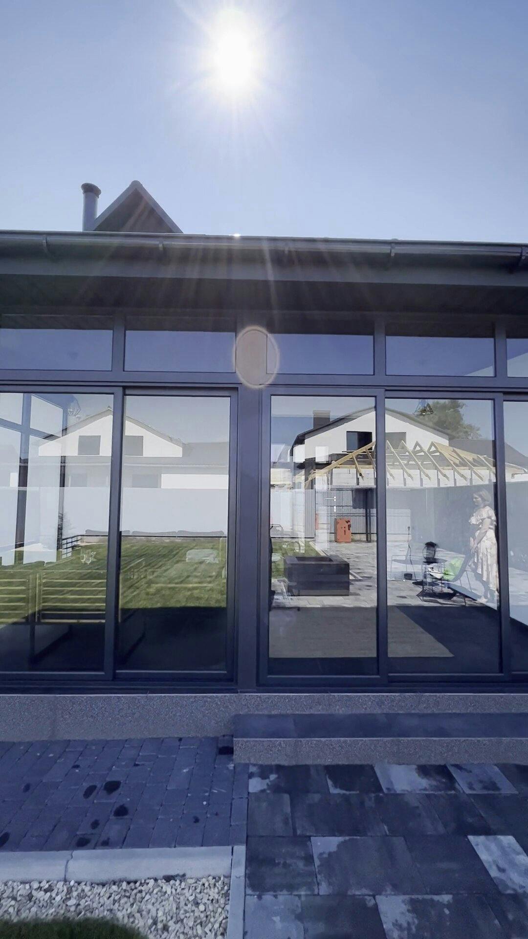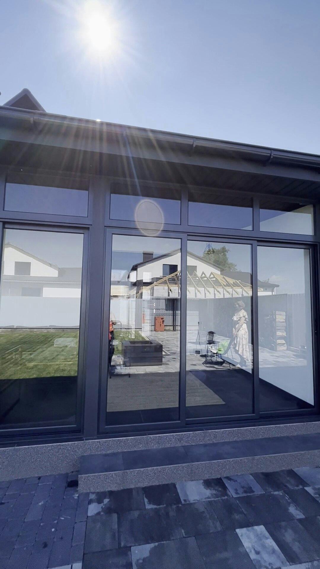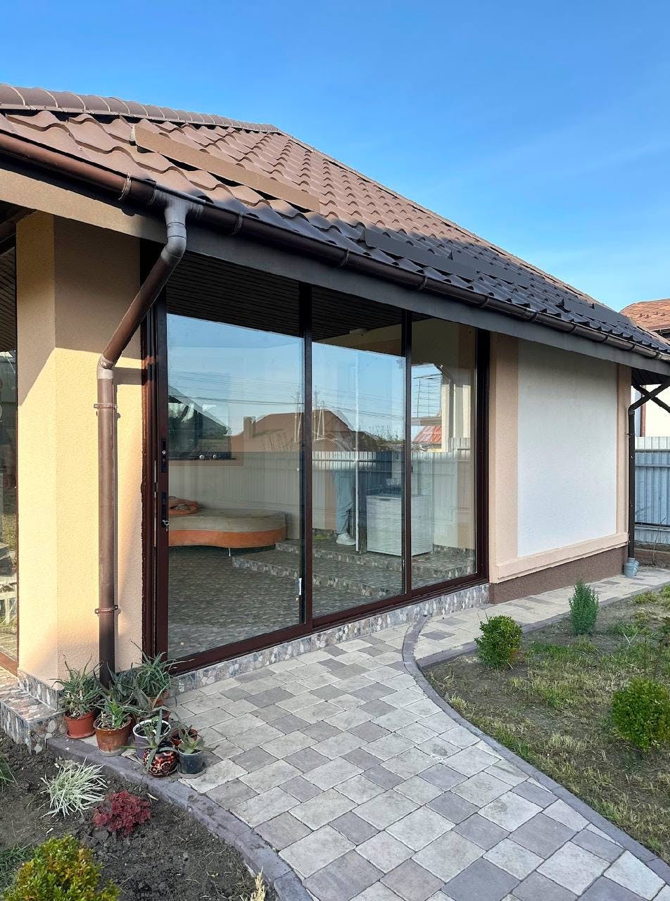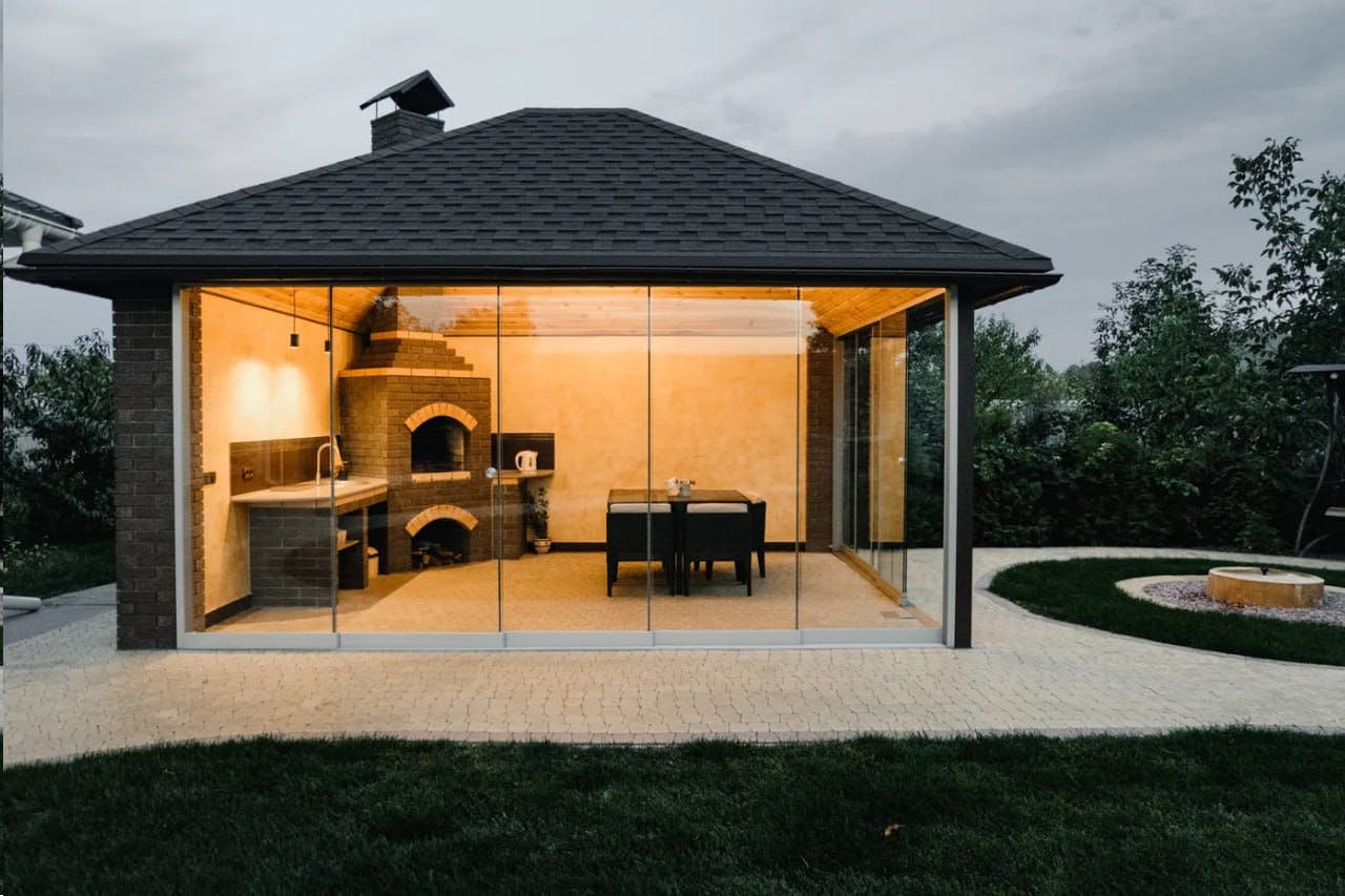 Конструкція виконана з загартованого сонцезахисного скла, яке зменшує вплив прямих сонячних променів, забезпечує комфорт і зберігає легкість простору. Прозорі панелі без рам створюють ефект відкритості та панорамного огляду, водночас захищаючи від вітру й опадів. Це ідеальне місце для барбекю, дружніх зустрічей і повноцінного релаксу просто біля вашого дому.